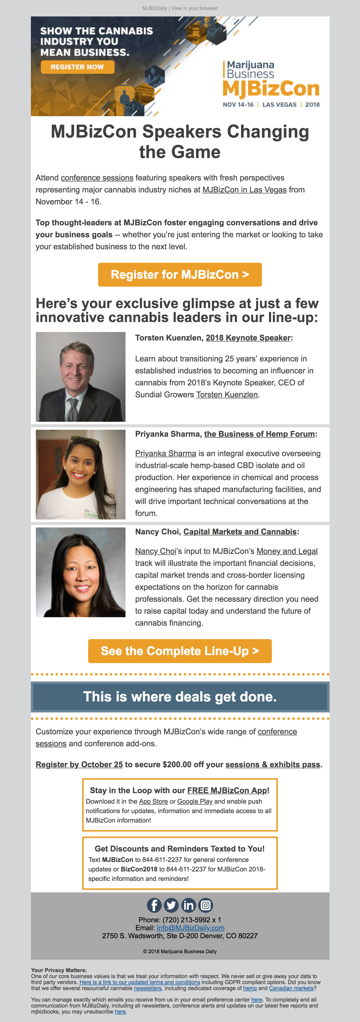 092018_MJBizCon_SpeakerPromo Published 2018/10/05 at 1446 × 4100 in 092018_MJBizCon_SpeakerPromo (EVENT) MJBizCon email introducing prominent speakers and conference tracks